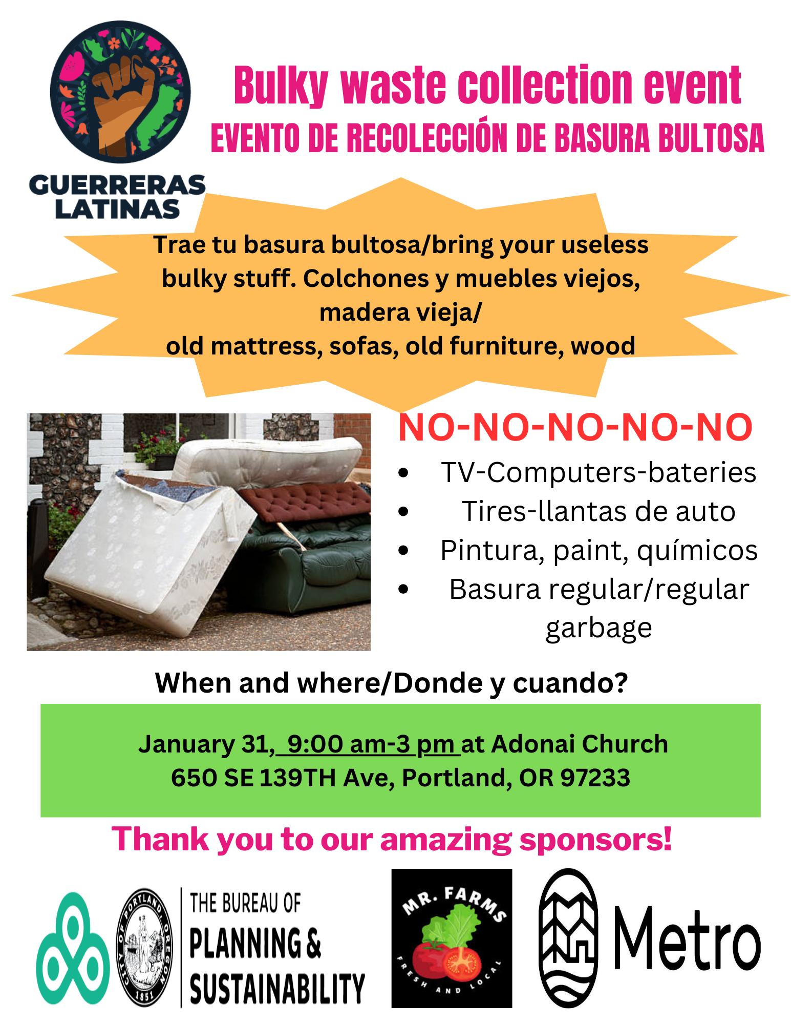 2026-01-31 Bulky Waste Collection Posted byKaren WolfgangJanuary 30, 2026March 24, 2026Posted inCity of Portland, Community, Events, FREE, Local Government January 31, 20269 am-3 pmAdonai Church, 650 SE 139th Ave.Another opportunity for getting rid of trash and stuff!!