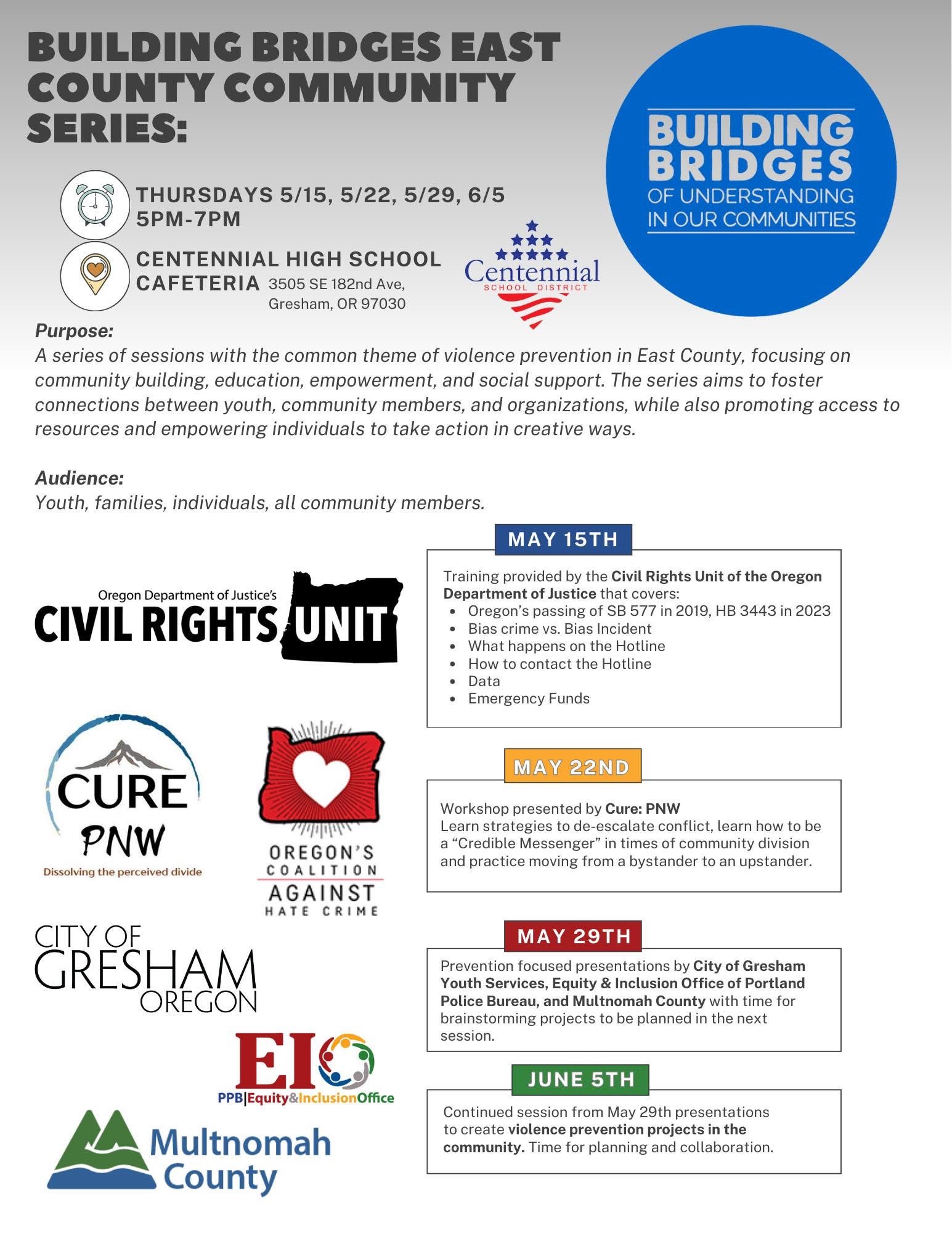 A series of sessions with the common theme of violence prevention in East County, focusing on community building, education, empowerment, and social support. The series aims to foster connections between youth, community members, and organizations, while also promoting access to resources and empowering individuals to take action in creative ways.